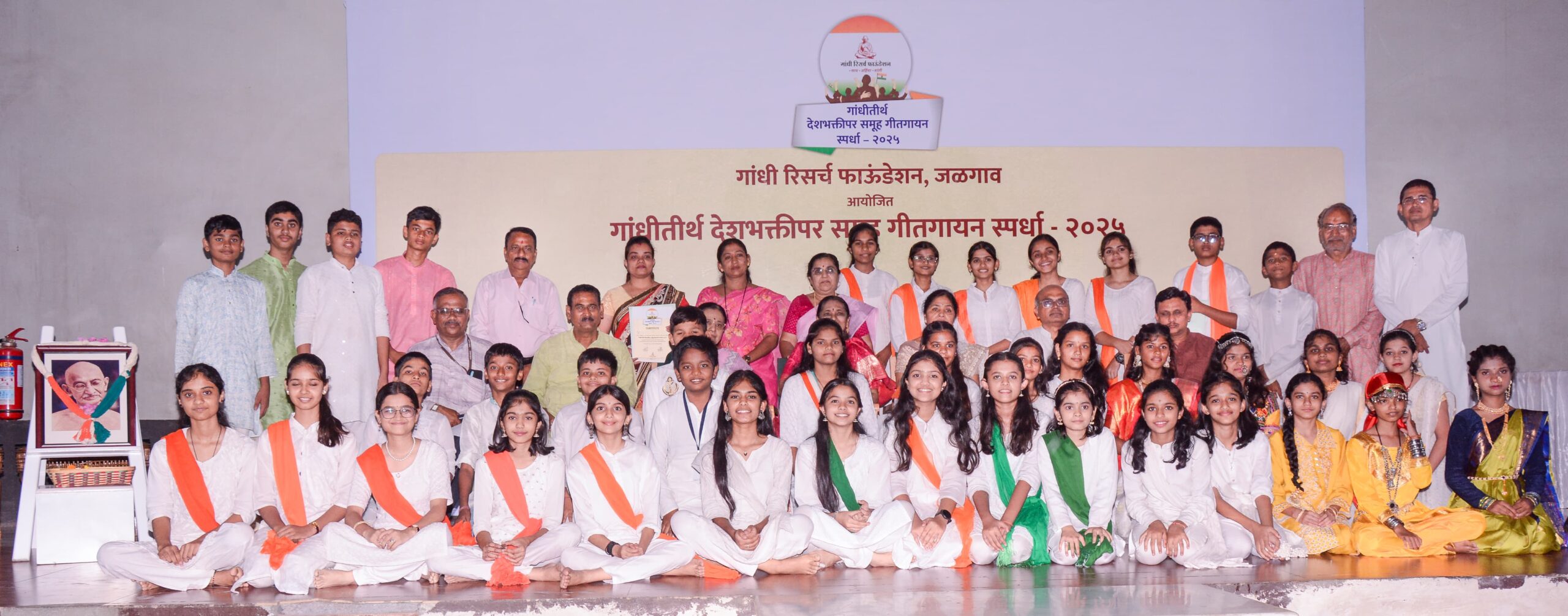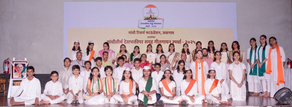 जळगाव, दि. १ ऑक्टोबर ( प्रतिनिधी) : येथील गांधी रिसर्च फाऊंडेशनच्या वतीने ३० सप्टेंबर रोजी कांताई सभागृहात आयोजित ‘गांधीतीर्थ देशभक्तीपर समूह गीत गायन स्पर्धा’ उत्साहात संपन्न झाली. शहरी आणि ग्रामीण अशा दोन गटांमध्ये झालेल्या या स्पर्धेत एकूण १९ संघांनी सहभाग घेतला. देशभक्तीच्या गीतांनी सभागृह भारावले आणि उपस्थितांनी त्याला चांगला प्रतिसाद दिला. सर्वप्रथम डॉ. स्मिता पाटील यांच्याहस्ते महात्मा गांधींच्या प्रतिमेला माल्यार्पण झाले. स्पर्धेच्या परीक्षक विशाखा देशमुख, वृषाली जोशी आणि यांनी सहभाग घेतला.