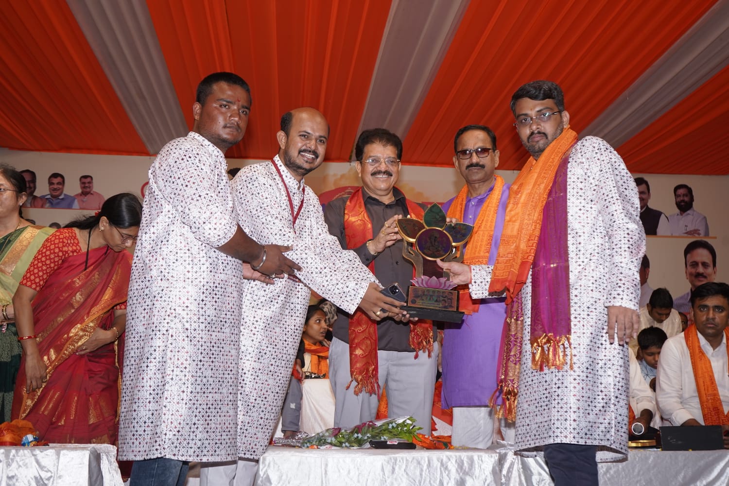भारतीय जनता पार्टी जळगाव जिल्हा महानगराच्या वतीने सालाबाद प्रमाणे याही वर्षी सार्वजनिक गणेशोत्सव मिरवणुकीमध्ये सहभागी होणाऱ्या 68 गणेश मंडळांना गणराया पुरस्कार 2025 ने सन्मानित करण्यात आले अतिशय भव्य असं व्यासपीठ टावर चौक येथे भारतीय जनता पार्टीचे भव्य व्यासपीठ उभारण्यात आले होते या ठिकाणी एलईडी स्क्रीन द्वारे रोषणाई करण्यात आली होती तसेज राष्ट्र पुरुषांचे प्रतिमा व त्यांचे संदेश या एलईडी स्क्रीन द्वारे दिसत होते